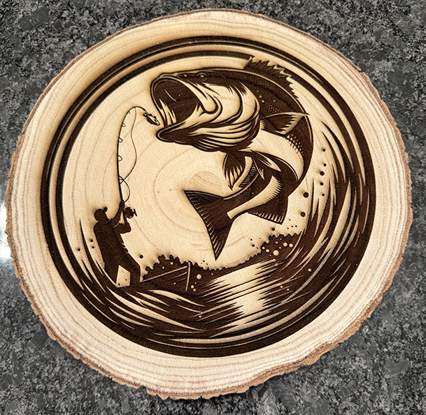This wood plaque is laser engraved with the image of a fisherman and his catch. The plaque is engraved on a wood slice and is approximately 12″ in diameter and 1/2″ thick. A perfect gift for the avid fisherman. This is currently one of two fishing images that I have done.