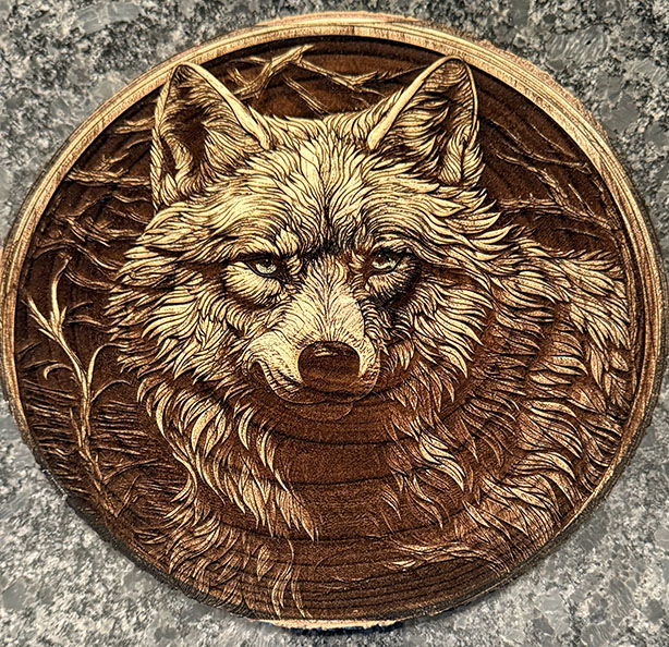This Laser Engraved Wolf is engraved on a slice of wood, approximately 10″ in diameter and 1/2″ thick. The eyes have been hand painted with a little bit of gold acrylic paint, just for a little highlight.